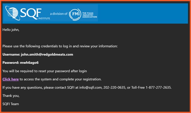 • Aucun courriel après 20 minutes : Vérifier le pourriel/le pourriels pour les messages provenant Métrique de conformité. S'il manque toujours l'e-mail, essayez Mot de passe oublié sur la page de connexion ou sur la personne-ressource Courriel : info@sqfi.com.