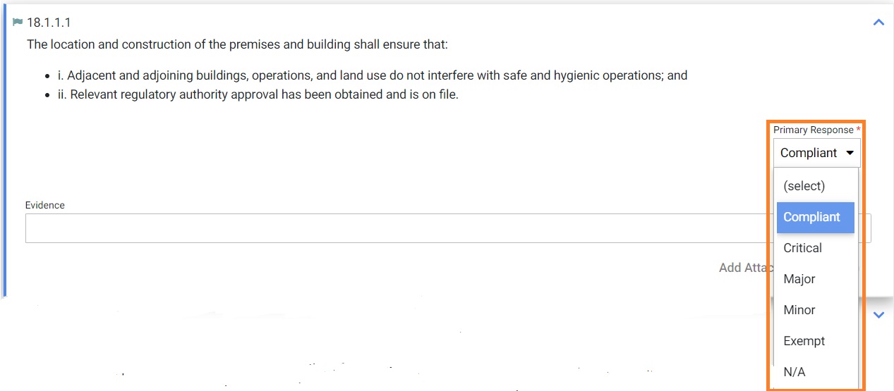 9. To answer module section questions there are click on the “Primary Response” dropdown where you will choose your answer. There are six choices for answers: “Compliant”, “Critical”, “Major”, “Minor”, “Exempt”, and “N/A”. For all answers outside of complaint “Evidence” must be entered into the “Evidence” field. If you answer is “Exempt” you will see the following message appear, “The site must present an approved exemption from the certification body. If no document exists, please select N/A and note the reason the element is not applicable.”