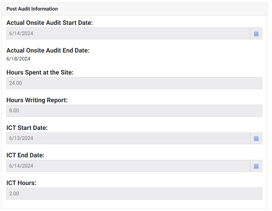 13. Make sure that all corrective actions have been completed for review. After they have all been submitted you will need to submit the post Audit information. This can be found at the bottom of the page, and you will need to enter the following information: “Actual Onsite Audit Start Date:”, “Actual Onsite Audit End Date:”, “Hours Spent at the Site:”, “Hours Writing Report:”, “ICT Start Date:”, “ICT End Date:”, and “ICT Hours:”. After you have completed entering the information return to the top of the page and click the blue “SUBMIT” button.
