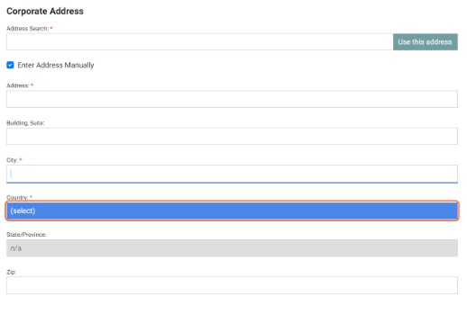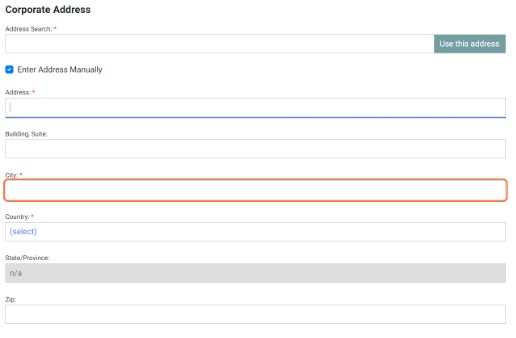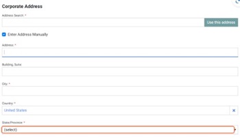 16。会社の「国」を入力すると、会社の「州/都道府県」と「郵便番号」が必須になり、これらのフィールドに入力する必要があります。