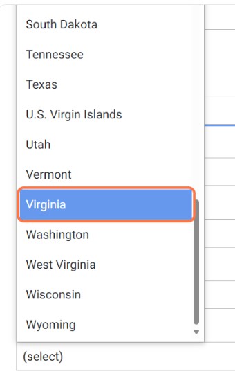 17。会社の「州/都道府県」を選択するには、「選択」テキストをクリックします。ドロップダウンリストが開き、リストをスクロールして「州/都道府県」をクリックして選択します。