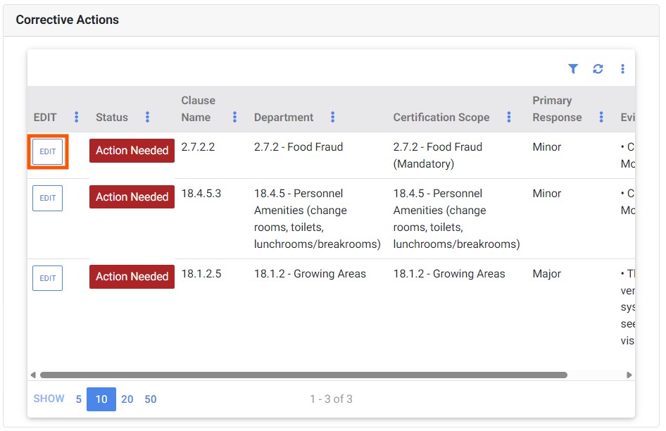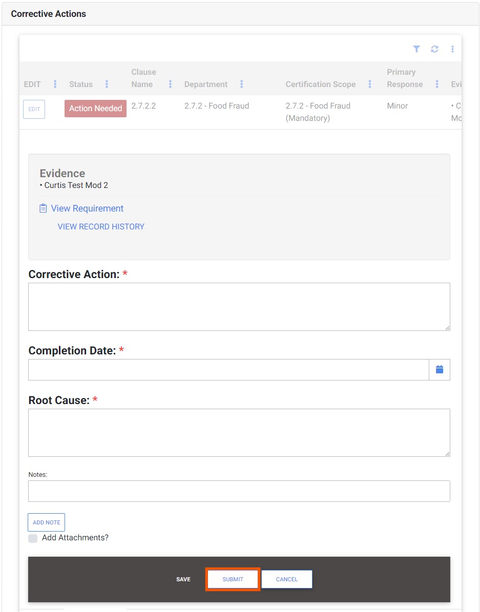 4. Para abordar uma “Ação Corretiva”, clique no botão azul “EDITAR”. Isso abrirá os campos “Ação corretiva”.